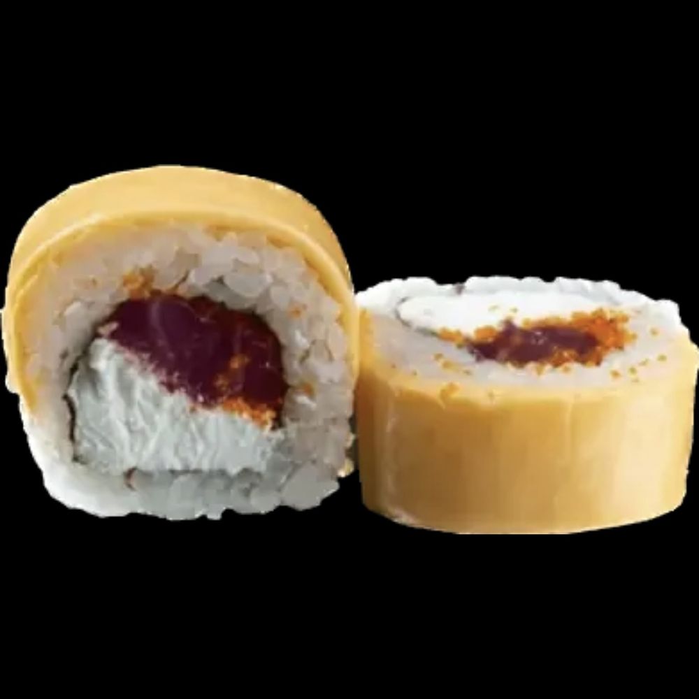 Тунец, сыр креметта, сыр чеддер, икра масаго, рис, нори.