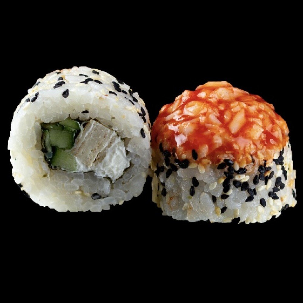 Креветка, креметта, томаго, огурец, кунжут ч/б, соус Шрирача, рис, нори.