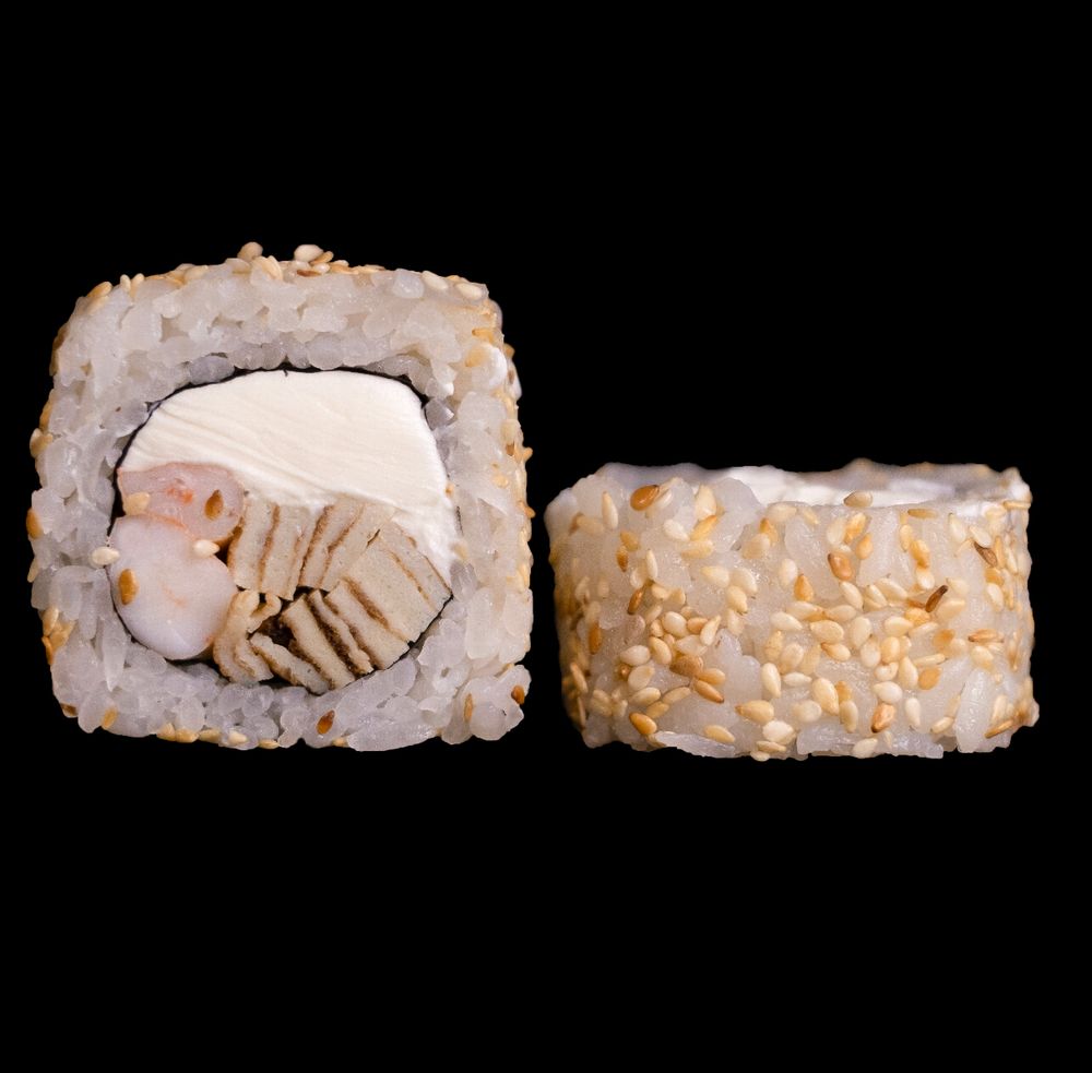 Тигровая креветка, сыр креметта, томаго омлет, кунжут белый, рис, нори.