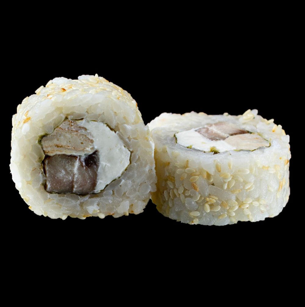 Угорь, сыр креметта, омаго томлет, кунжут белый, рис, нори.
