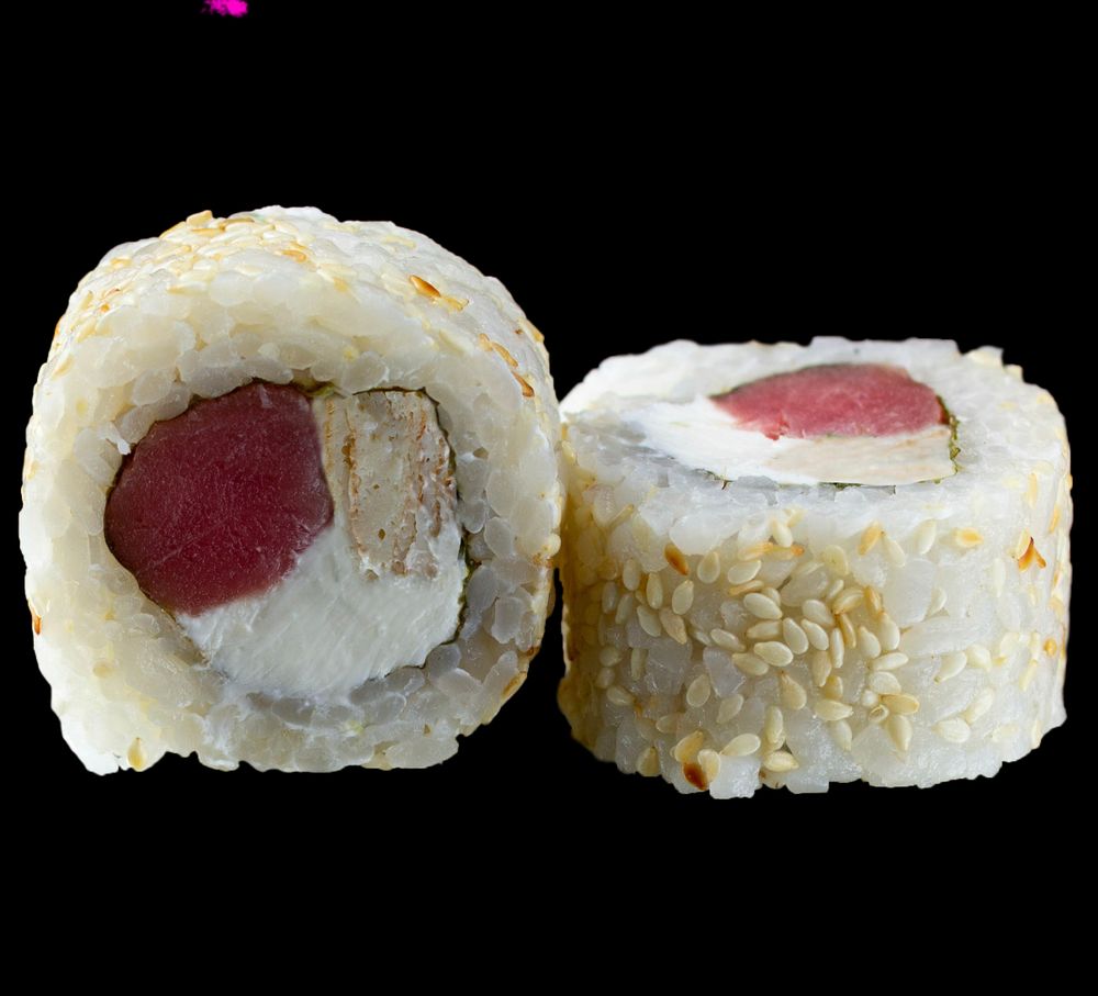 Тунец, сыр креметта, томаго омлет, кунжут белый, рис, нори.