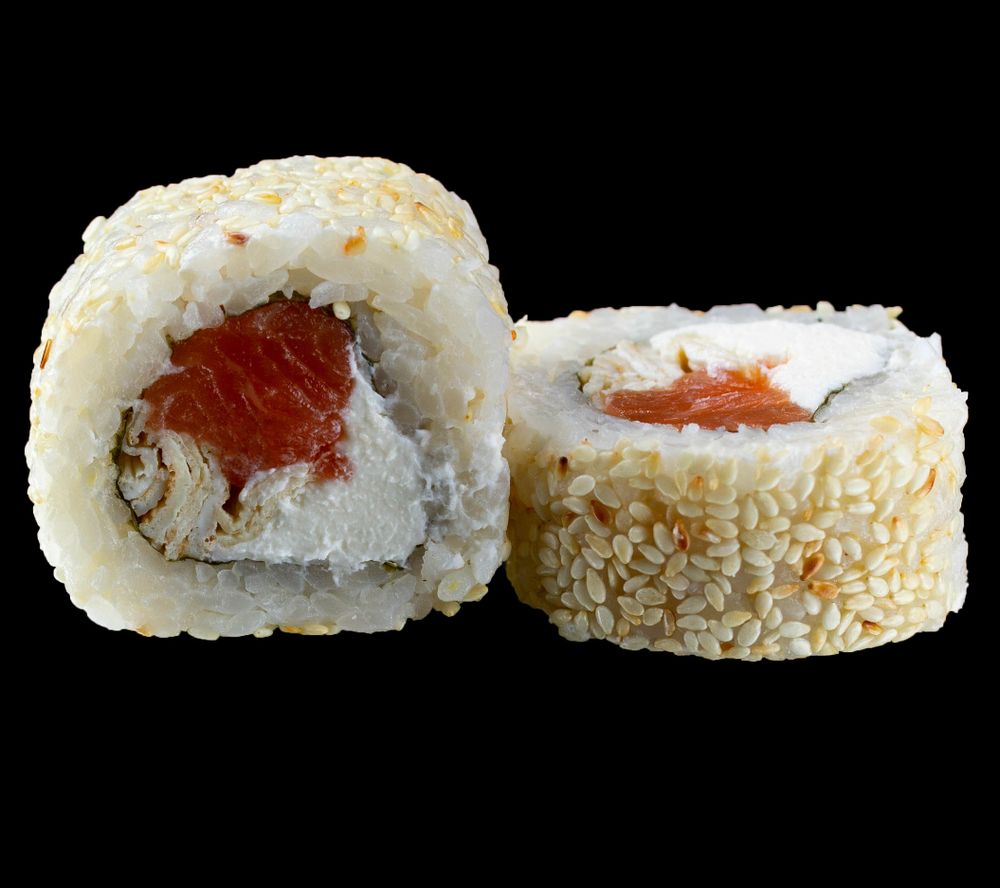 Лосось, сыр креметта, томаго омлет, кунжут белый, рис, нори.