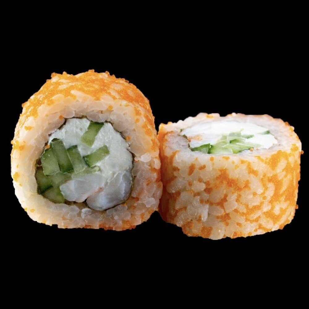 Тигровая креветка, сыр креметта, огурец, икра масаго, рис, нори.