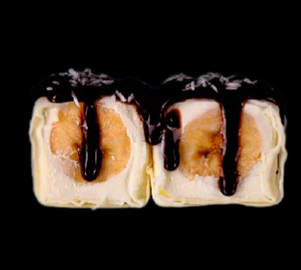 Ворожный сладкий сыр креметте с бананом , спринг тесто, украшен шоколадным соусом.