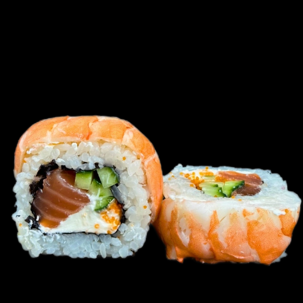 Лосось, креветка тигровая, сыр креметта, огурец, рис, нори.