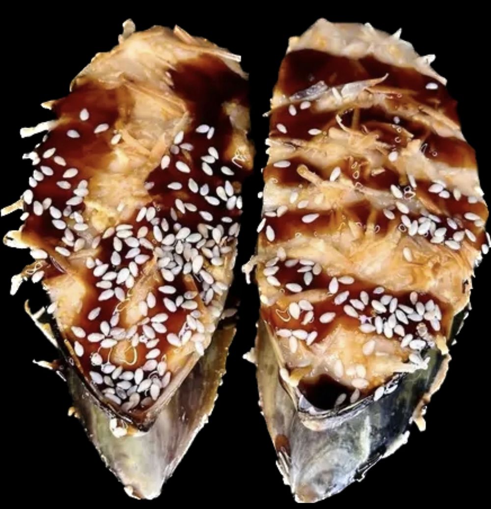Запеченные мидии в фирменном соусе с пармезаном, соусом унаги и кунжутом.