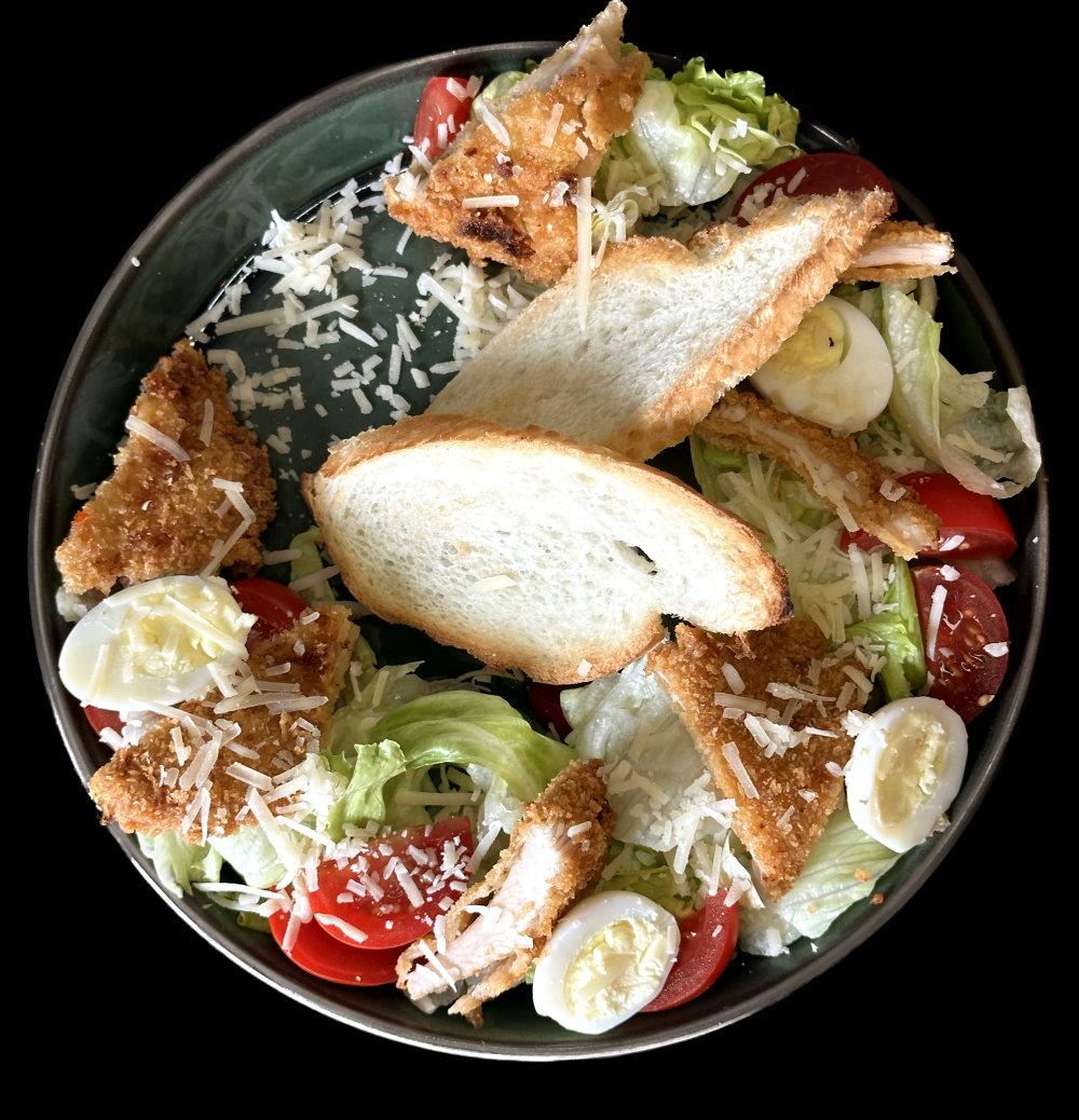 Курица в панировке, микс салатов, черри, перепел. яйцо, Пармезан, соус, гренки