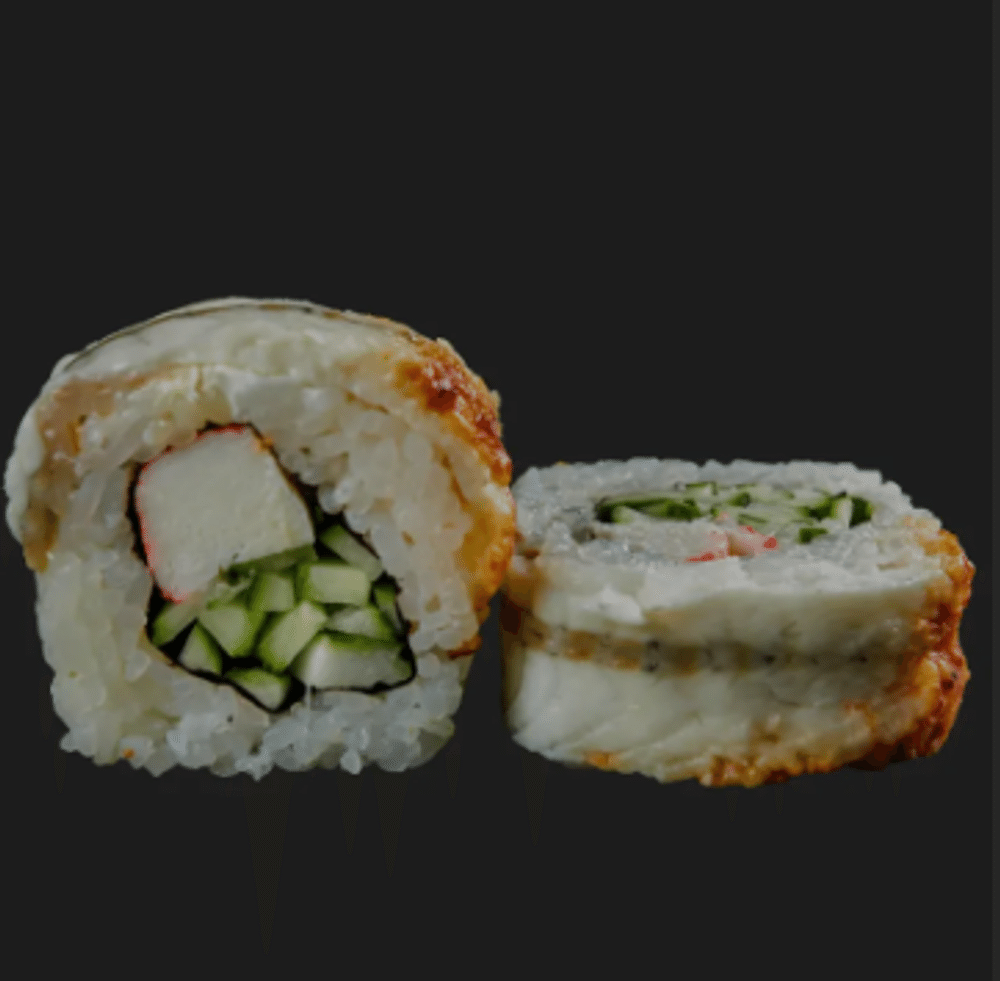 Угорь, огурец, снежный краб, соус унаги, кунжут белый, рис, нори.
