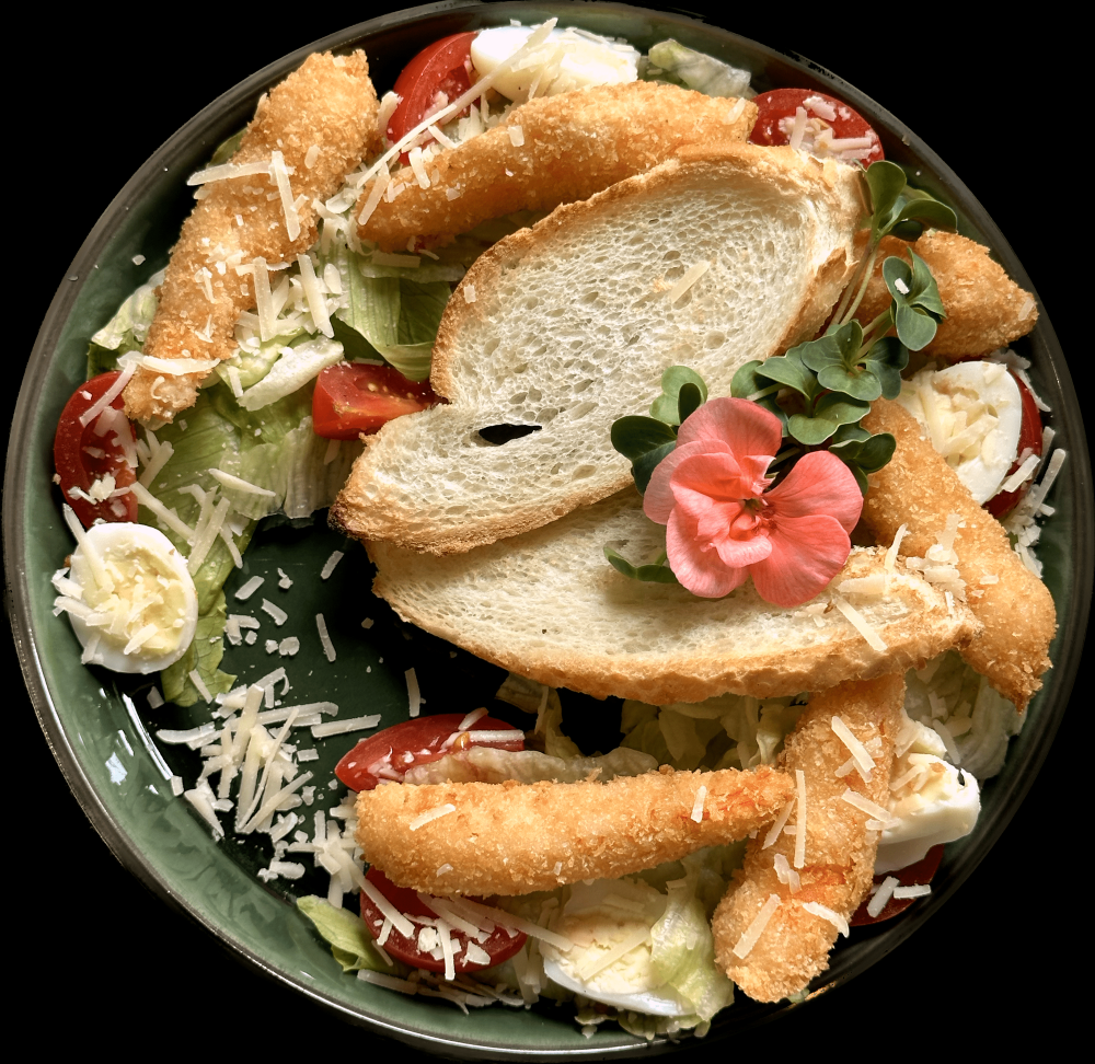 4 обжаренные креветки разрезанные на пополам, микс салатов, томат черри, перепел. яйцо, Пармезан, соус, гренки