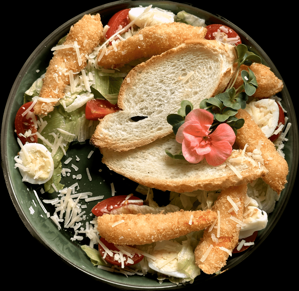 4 обжаренные креветки разрезанные на пополам, микс салатов, томат черри, перепел. яйцо, Пармезан, соус, гренки.