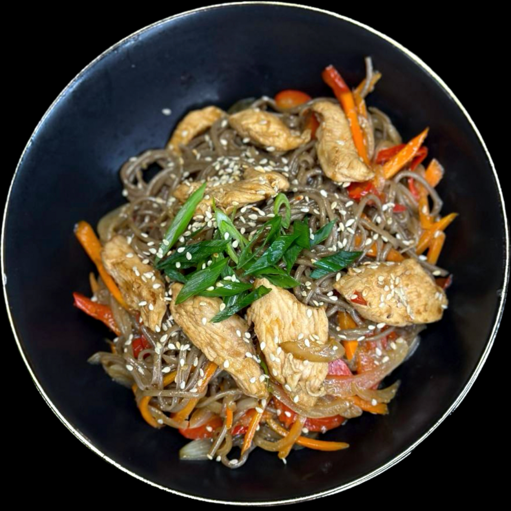 Лапша соба с куриным филе в фирменном соусе, морковь, перец болгарский, репчатый лук, зеленый лук, кунжут