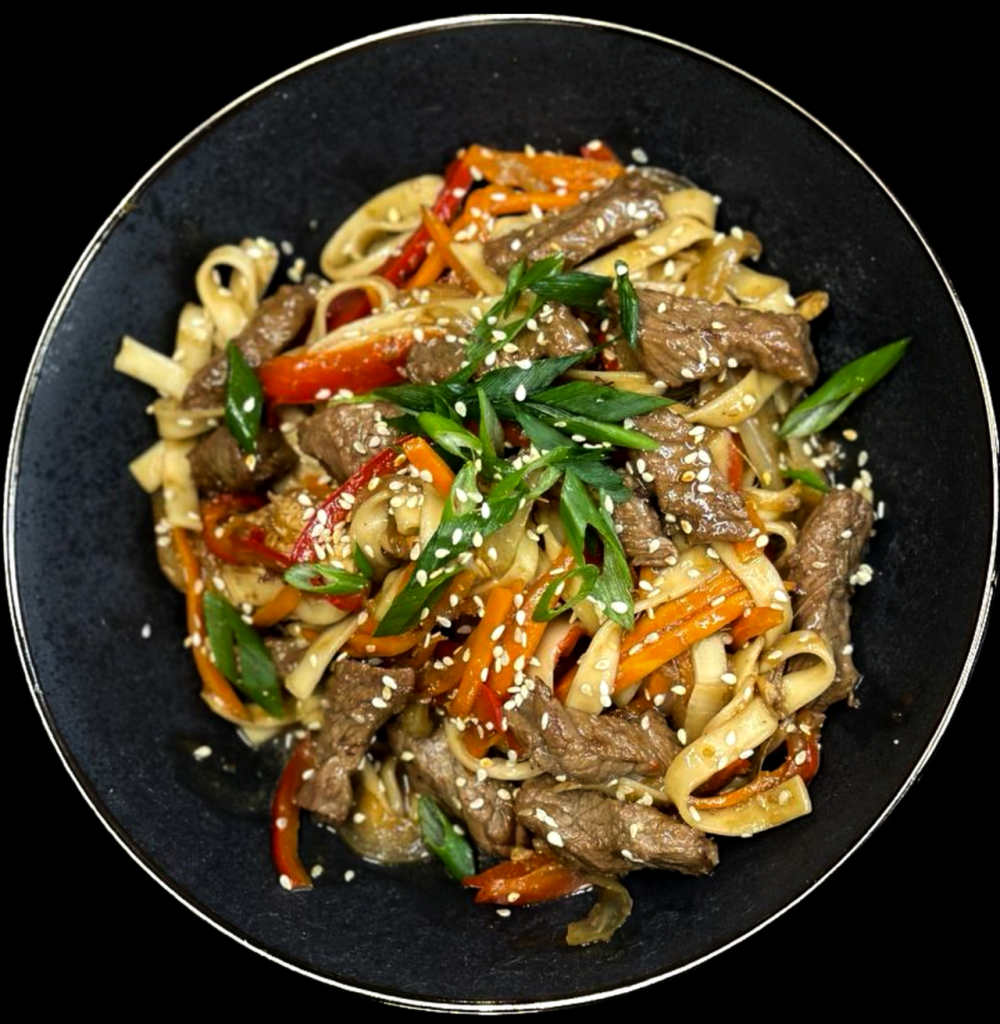 Лапша Удон с говядиной в фирменном соусе, морковь, перец болгарский, репчатый лук, зелёный лук, кунжут