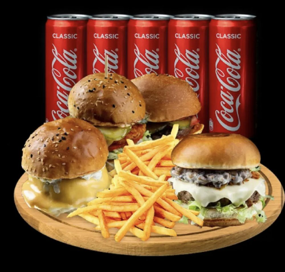 Чикен, Чизбургер, Сырный, Гамбургер, Грибной бургер, картофель фри, кока-кола