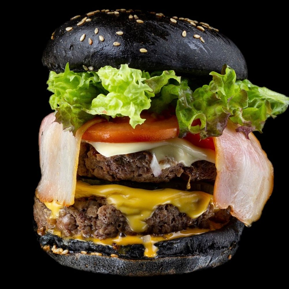 Белая булочка, двойная котлета из отборной говядины, бекон, фирм. соус, томат, мар. огурец, салат, два сыра.