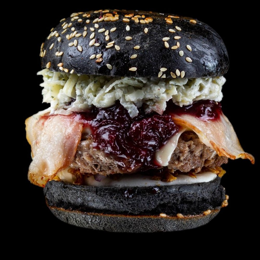 Белая булочка, котлета из отборной говядины, бекон, вишнёвый джем, соус «блю чиз», сыр креметта, сливочный сыр.