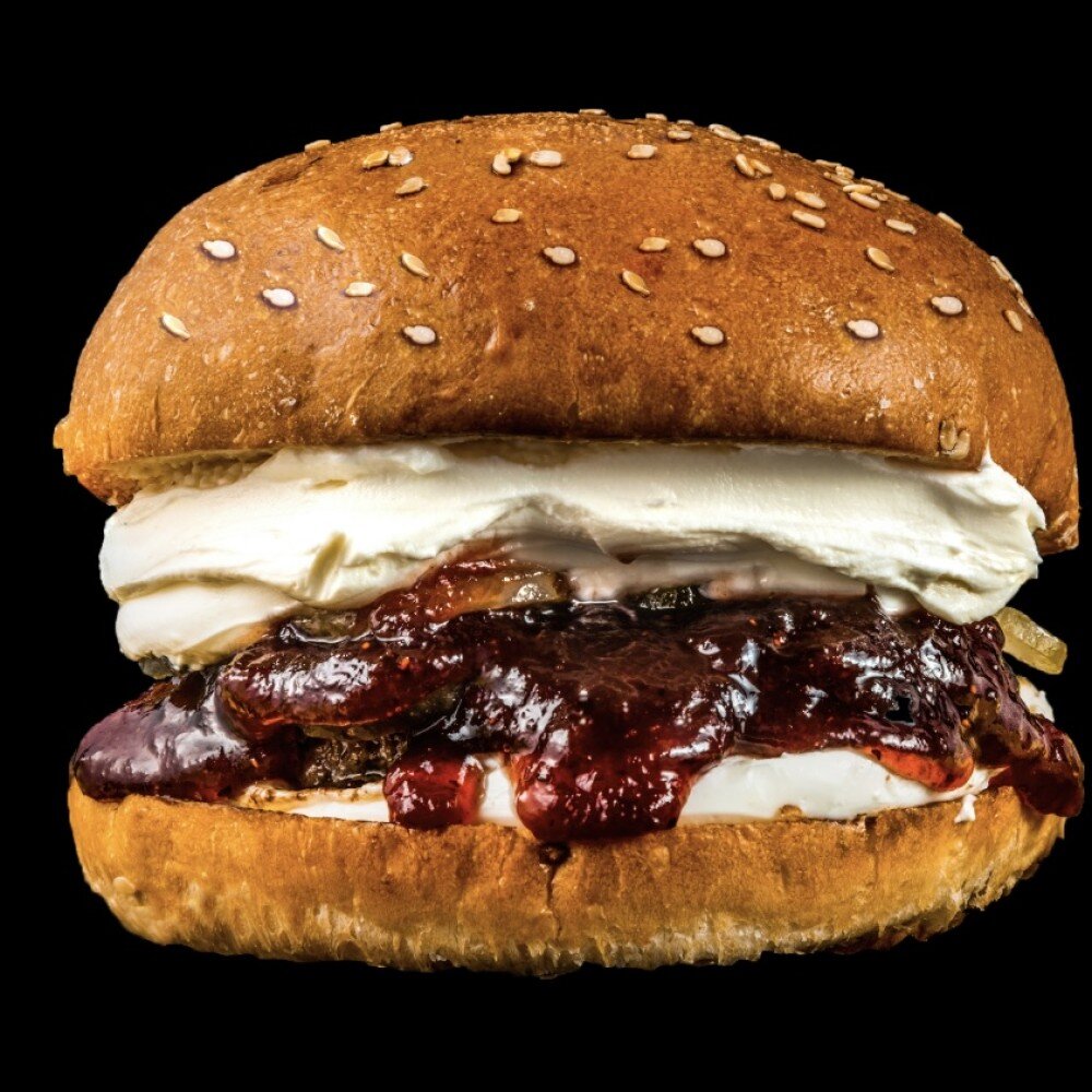 Булочка с кунжутом, котлета из отборной говядины, "Клюквенный" соус, сыр креметта, мар. огурец