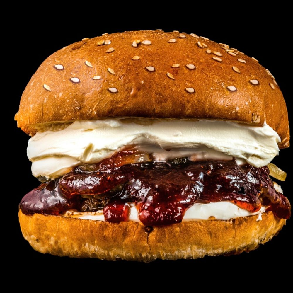Булочка с кунжутом, котлета из отборной говядины, "Клюквенный" соус, сыр креметта, мар. огурец.