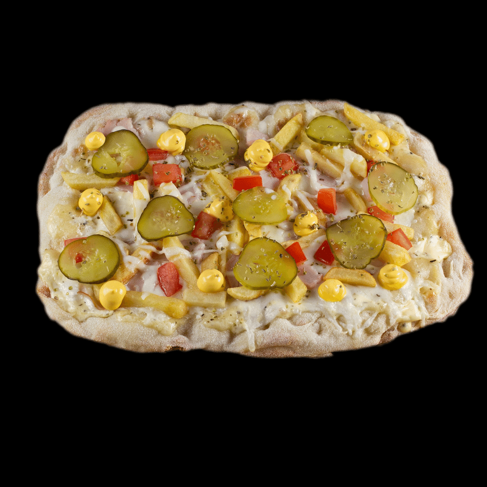 Ветчина, моцарелла, помидор, картофель фри, маринованный огурец, белый соус.