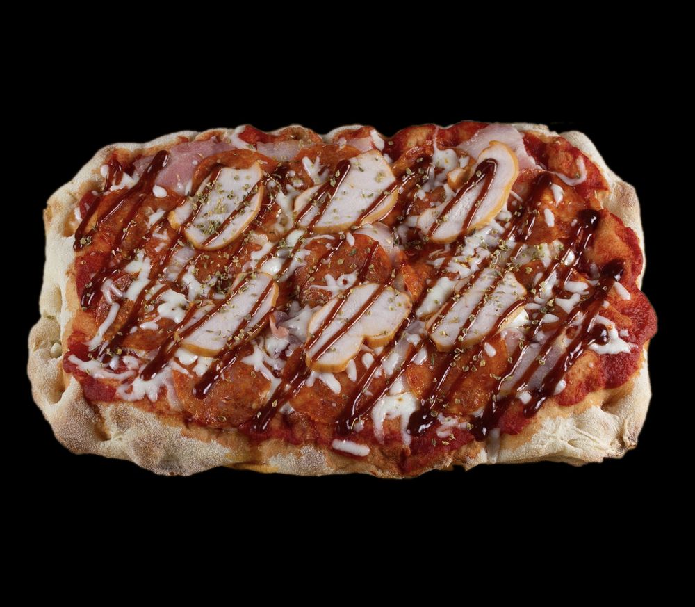 Ветчина, бекон, курица варено-копченая, пепперони, сыр моцарелла, красный томатный соус, соус BBQ.