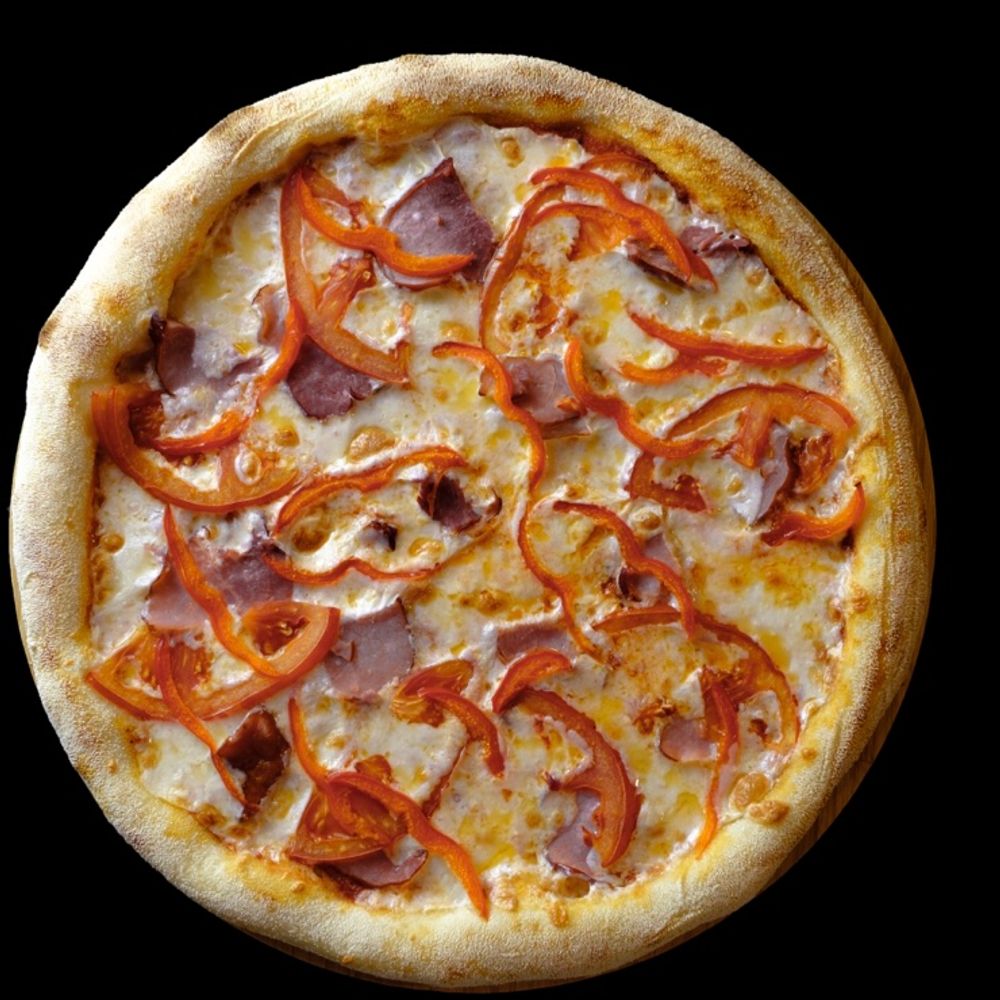 Красный соус, моцарелла, ветчина, болгарский перец, помидор.