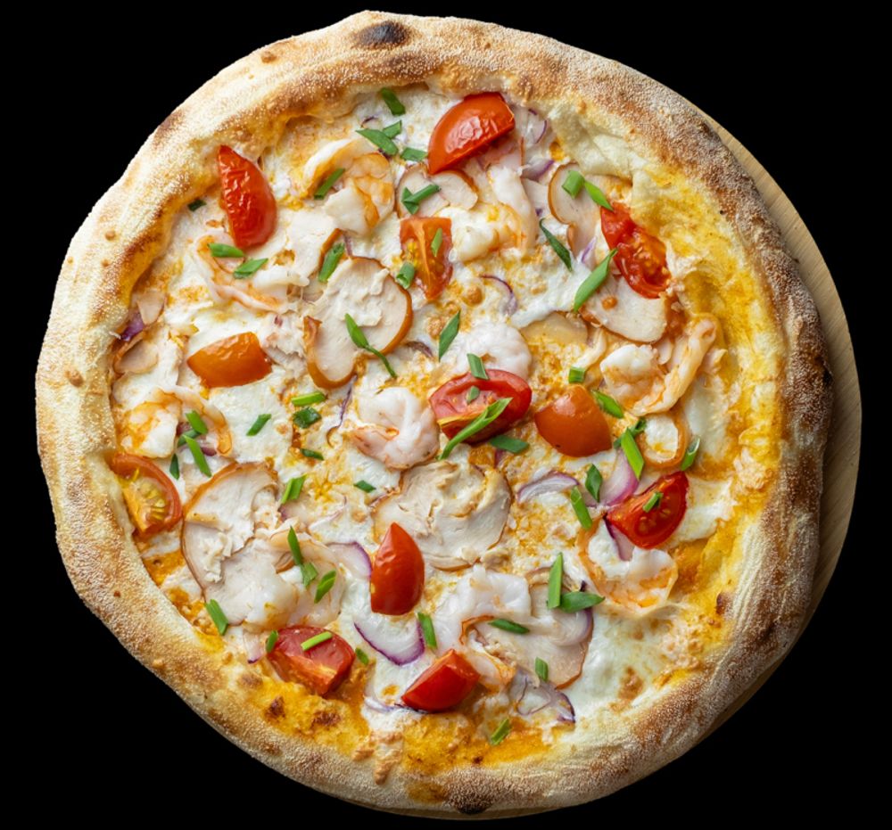 Красный соус, моцарелла, лук ялтинский, креветка, курица в/к, помидор черри, лук зеленый.