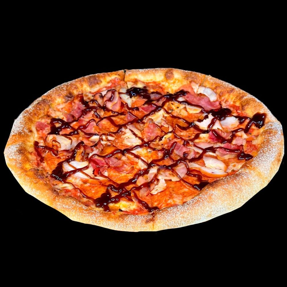 Ветчина, бекон, курица, пепперони, моцарелла, красный и BBQ соусы.