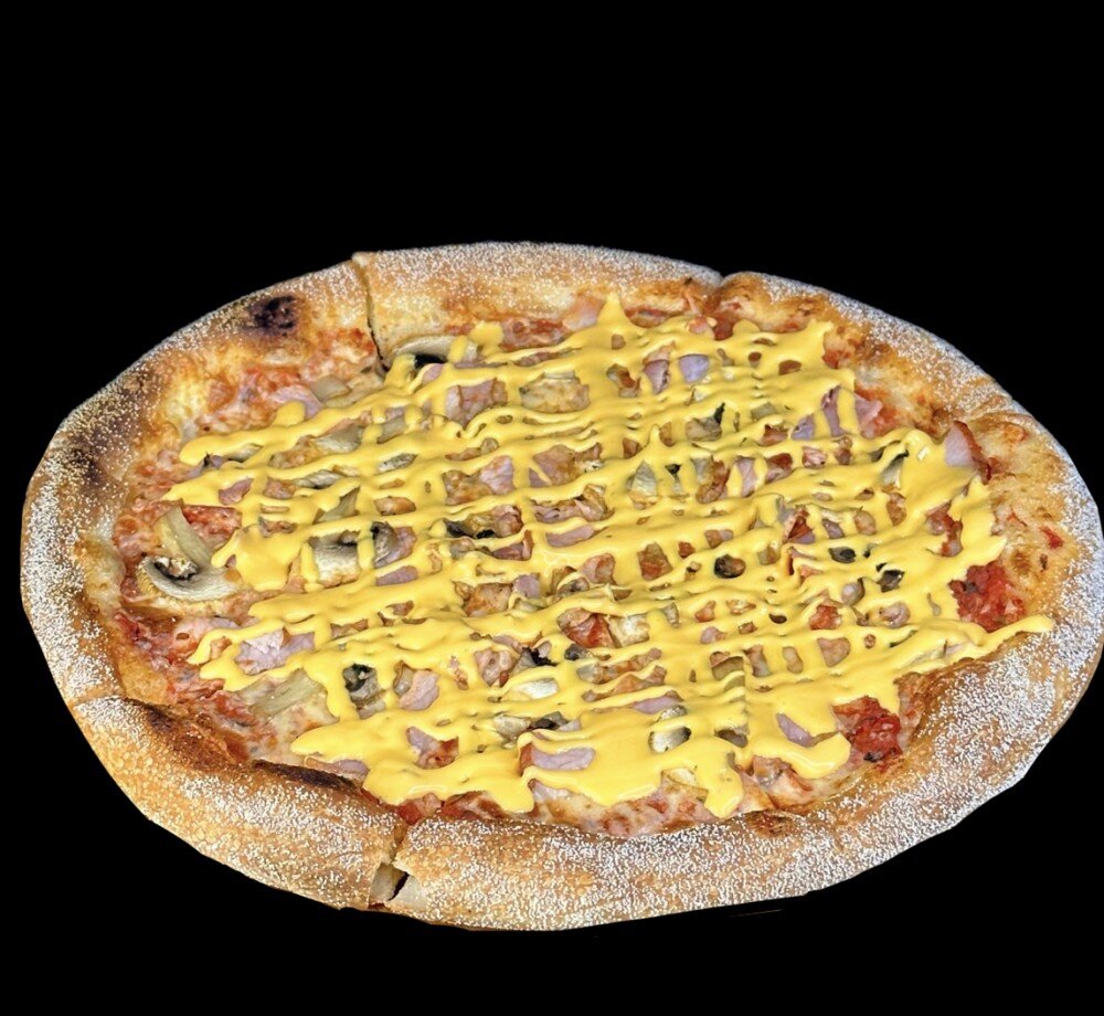 Ветчина, моцарелла, шампиньоны, чеддер, красный соус