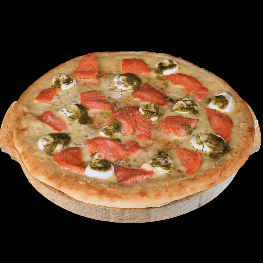 Лосось, моцарелла, креметта, соусы песто и белый.