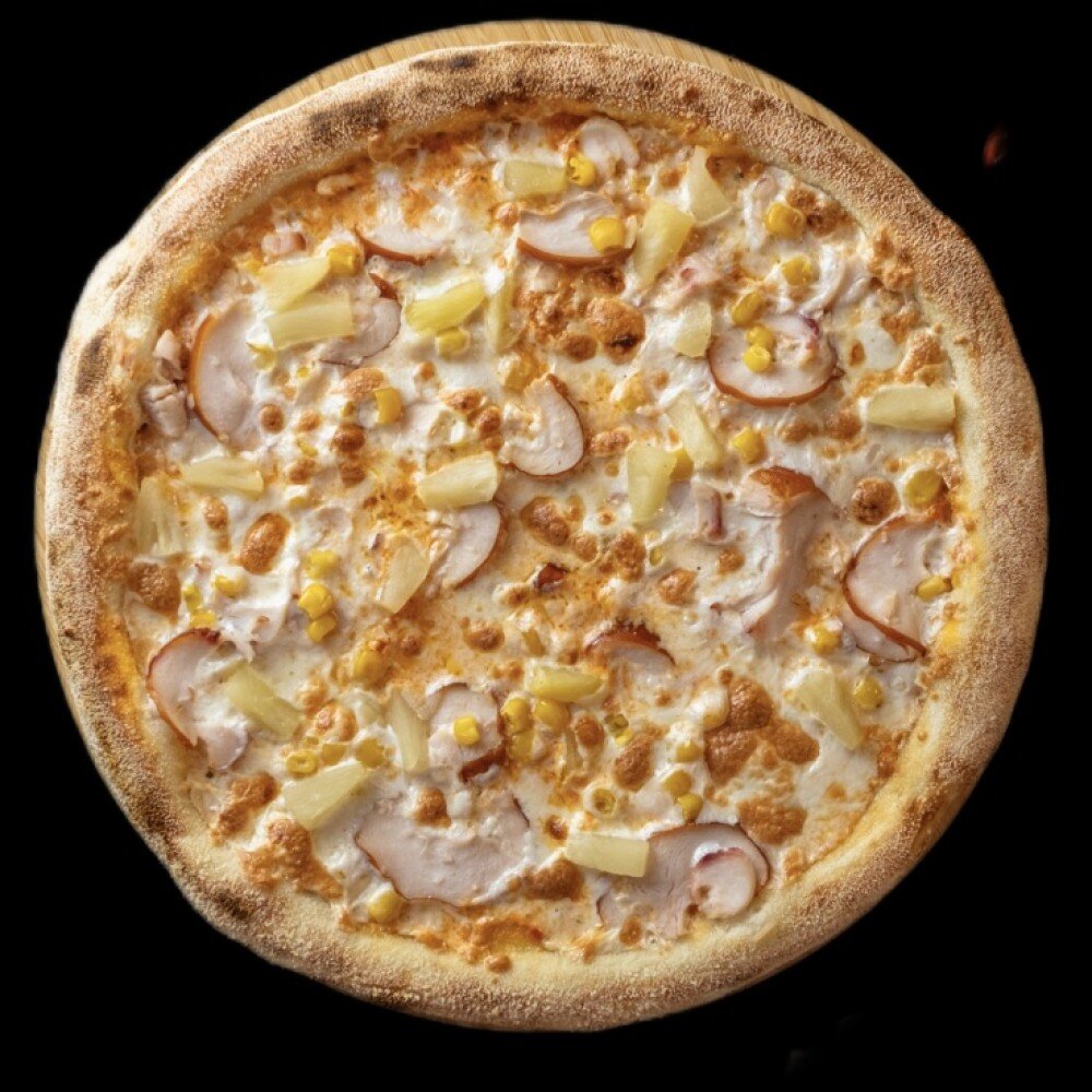 Курица варено-копченая, ананасы, моцарелла, белый соус