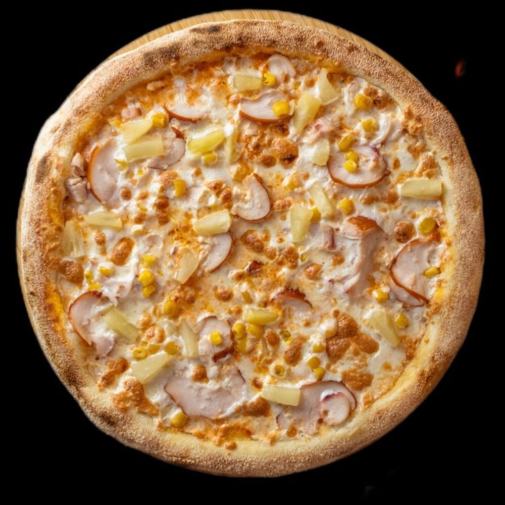 Курица варено-копченая, ананасы, моцарелла, белый соус.