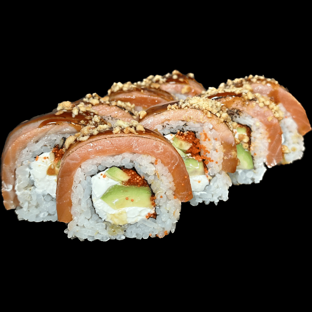 Лосось, авокадо, сыр креметта, икра масаго, фисташка, соус унаги, рис, нори.