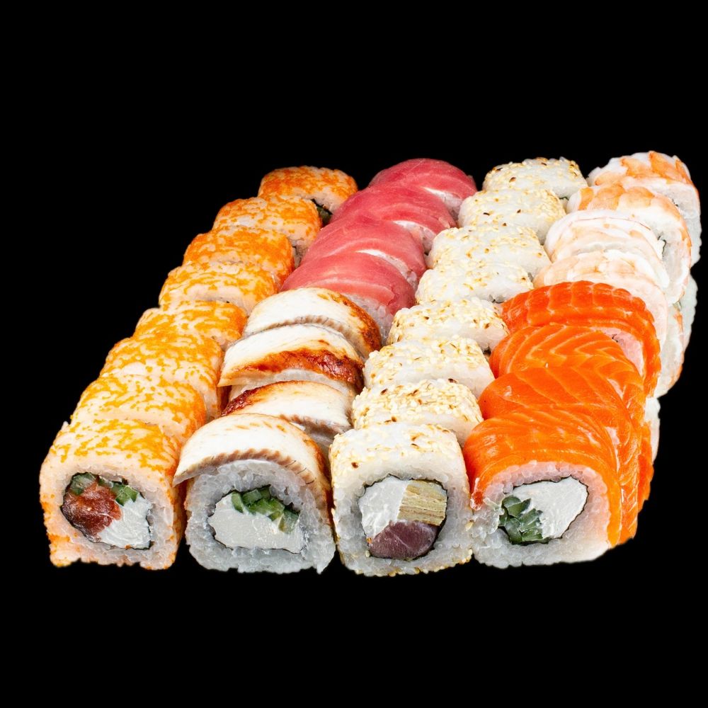 Филадельфия: лосось, тунец, угорь, креветка Калифорния: лосось, тунец Аляска: угорь, креветка Все 0.5 порции. Вес: 1150 г.