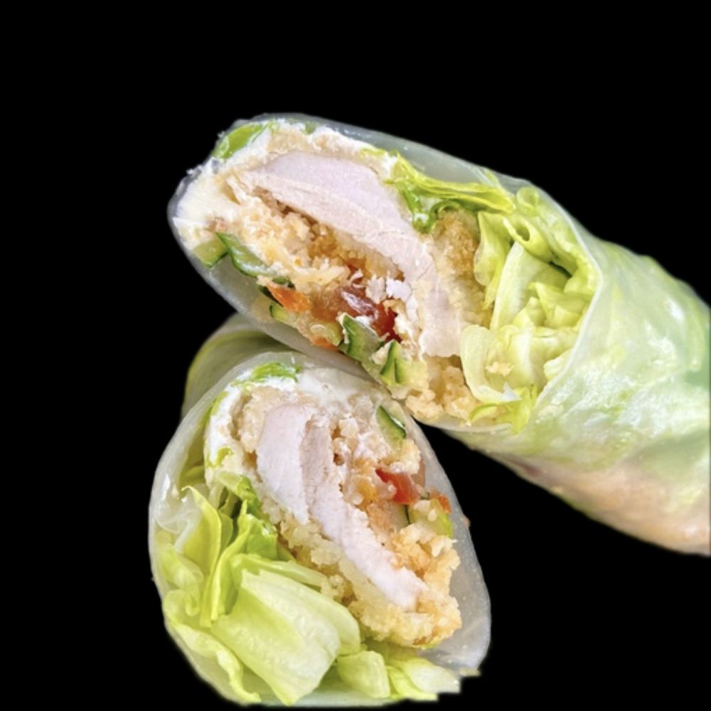 Куриное филе в панировке, сыр креметта, салат Айсберг, огурец, рис. бумага.
