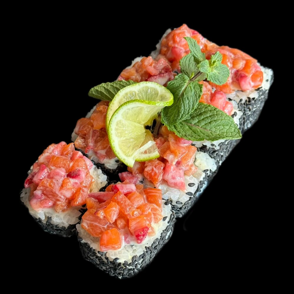 Лосось, клубника, манго, творожный сыр, рис, нори, соус из васаби со сгущёнкой