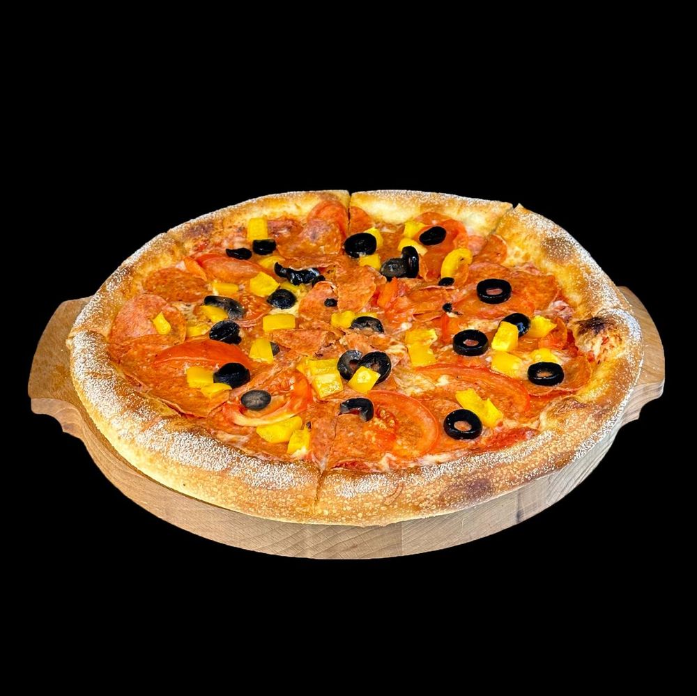 Пепперони, моцарелла, маслины, болгарский перец, помидор, красный соус.