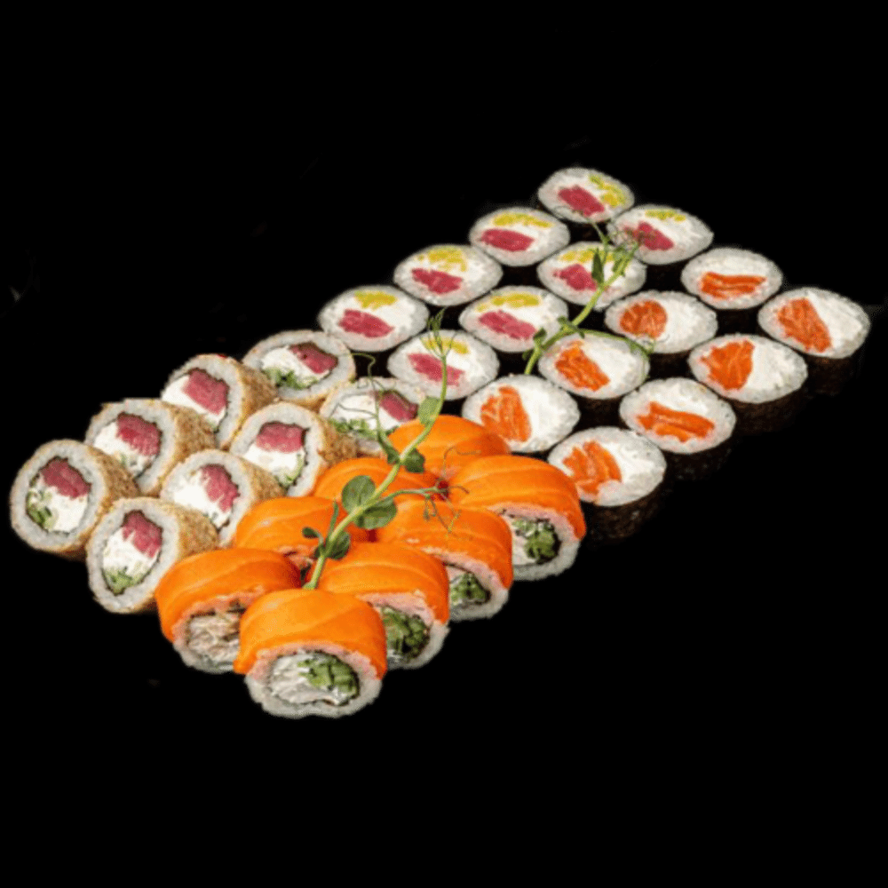 Чизи маки с лососем , Филадельфия лосось , ролл с тунцом и дайконом , ролл в кунжуте с тунцом