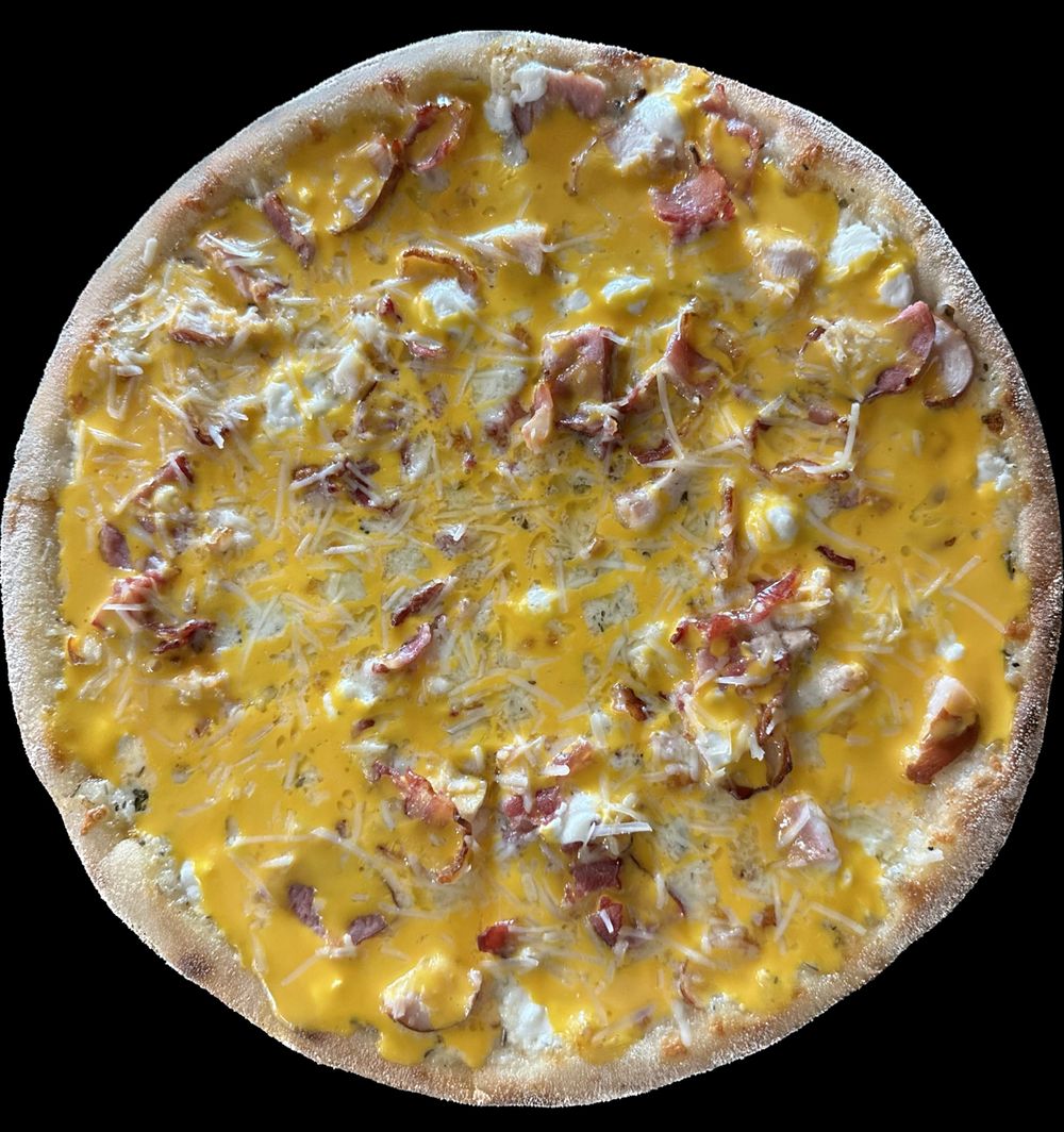Ветчина, бекон, курица в/к, моцарелла, пармезан, сыр фета, белый соус.