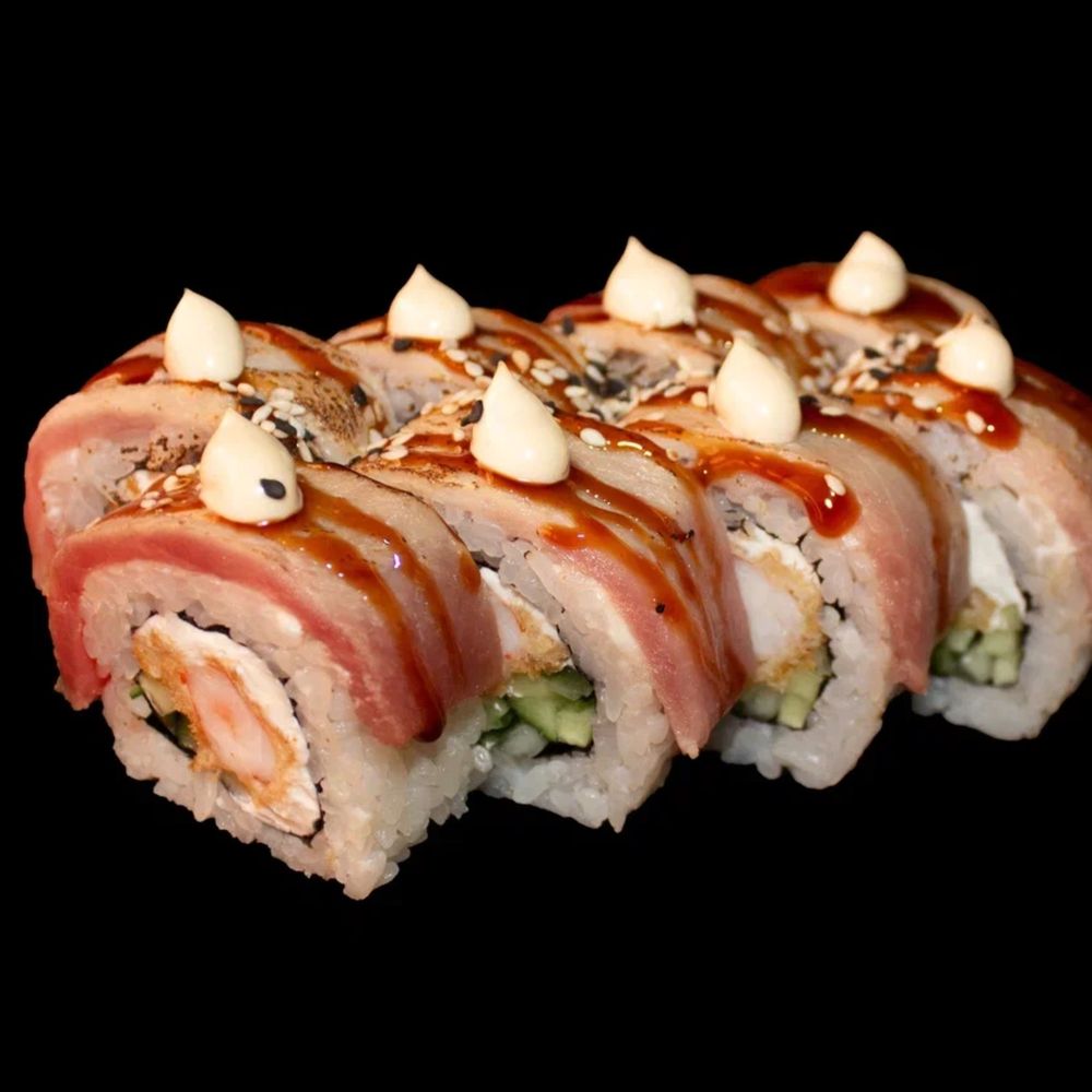 Тунец, креветка панко, огурец, сыр креметта, соус унаги, кунжут ч/б, японский майонез, рис, нори.