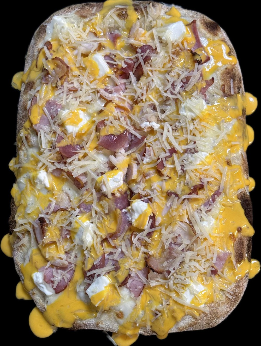 Варено-копченая курица, бекон, ветчина,моцарелла, пармезан, сыр чеддер, сыр фета белый соус.