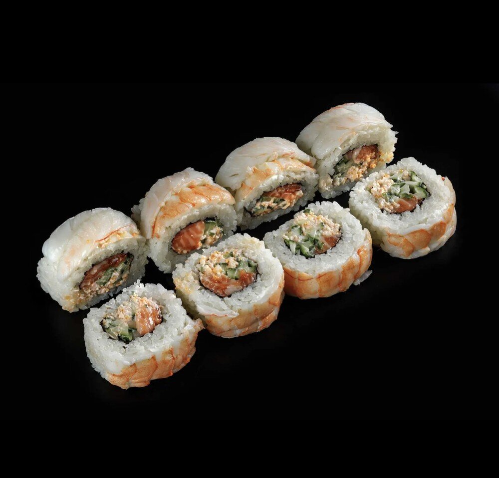 Креветка, лосось, снежный крем краб, огурец, рис, нори.