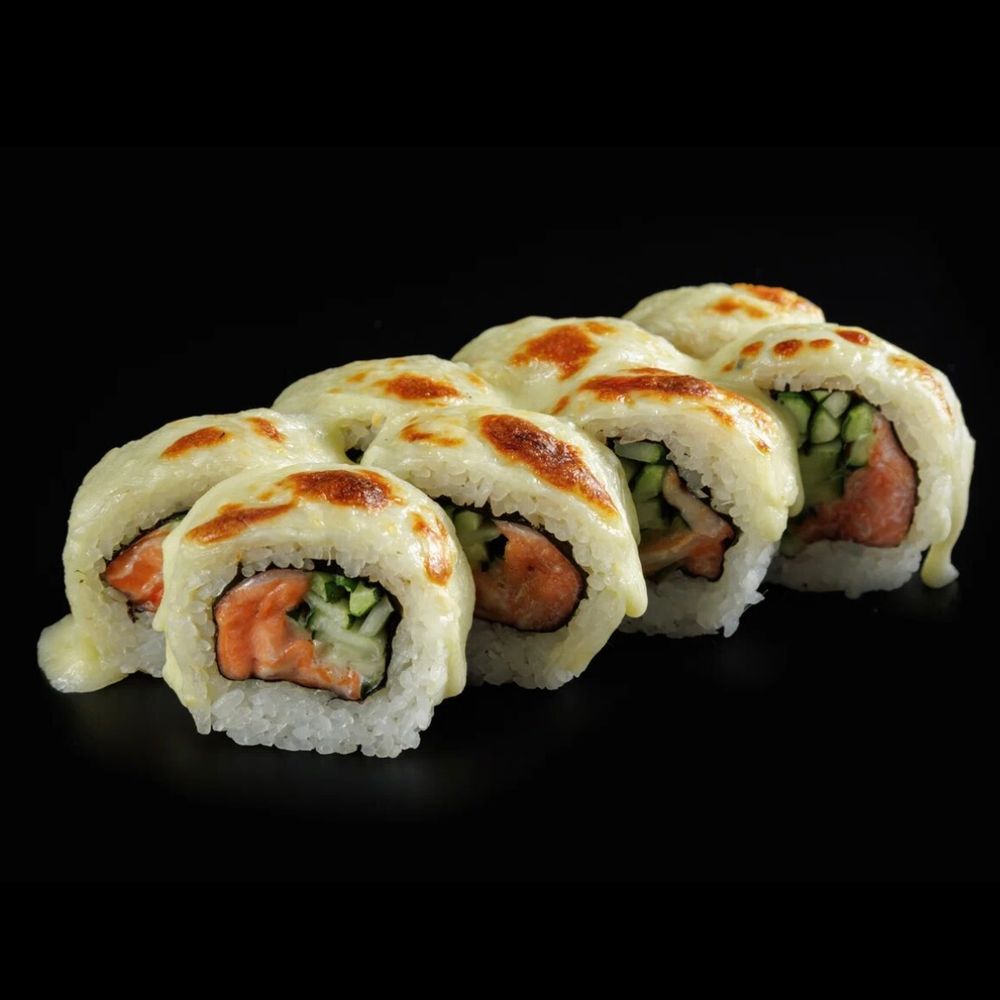 Лосось, сыр креметта, сыр моцарелла, огурец, соус унаги, зелёный лук, нори, рис.