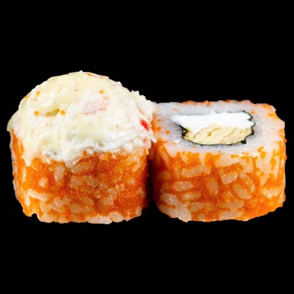 Снежный краб, сыр креметта, тамаго омлет, икра масаго, японский майонез, сыр моцарелла, рис, нори.
