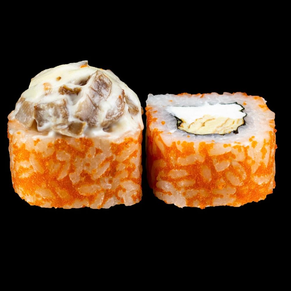Угорь, сыр креметта, тамаго, икра масаго, японский майонез, сыр моцарелла, рис, нори.