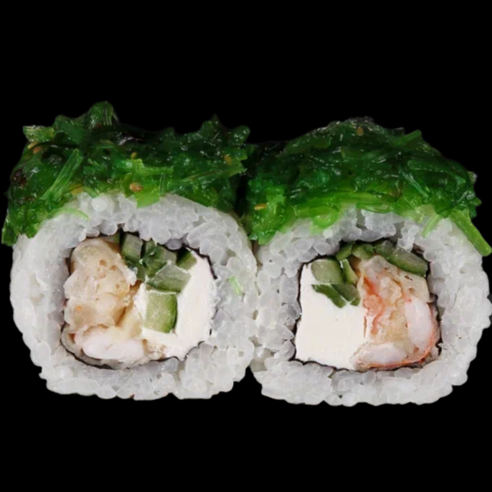 Креветка тигровая в тэмпуре, креметта, огурец, чука, рис, нори.