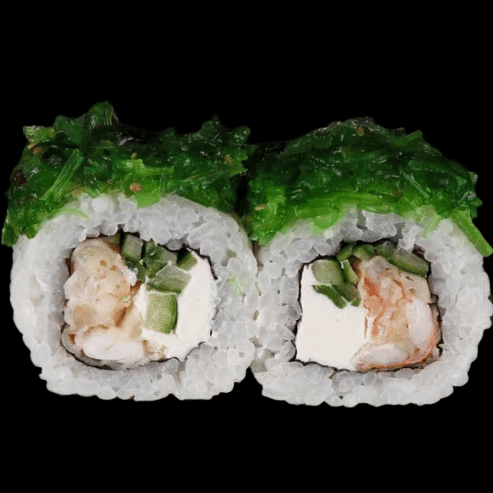 Креветка тигровая в темпуре, сыр креметта, огурец, чука, рис, нори.