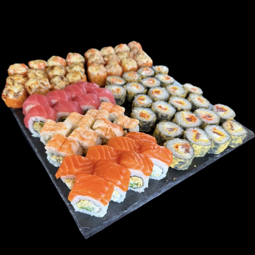 Мини запечённые: лосось, тунец, угорь; Мини драконы: красный (лосось), тигровый (креветка), бурый (тунец); Мини темпура: креветка, лосось, тунец.