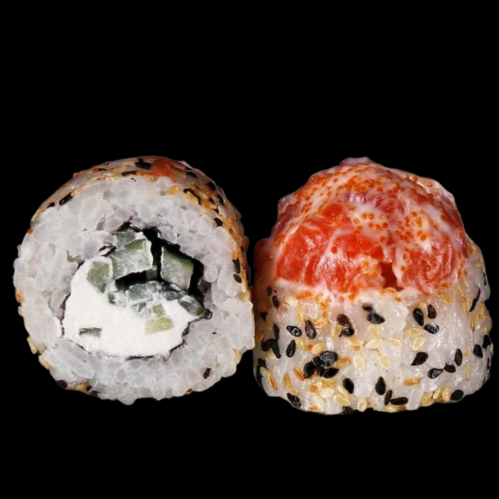 Лосось, креметта, огурец, томаго, икра масаго, японский майонез, кунжут ч/б, рис, нори.