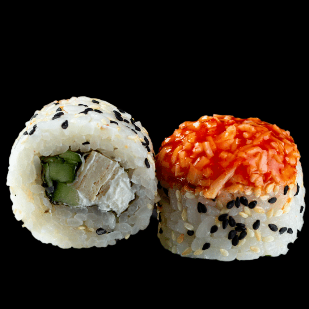 Снежный краб, сыр креметта, огурец, тамаго, японский майонез, икра масаго, кунжут ч/б, рис, нори.