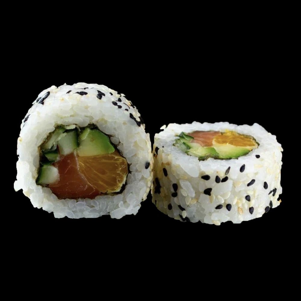 Лосось, авокадо, апельсин, огурец, кунжут чёрный/белый, рис, нори.
