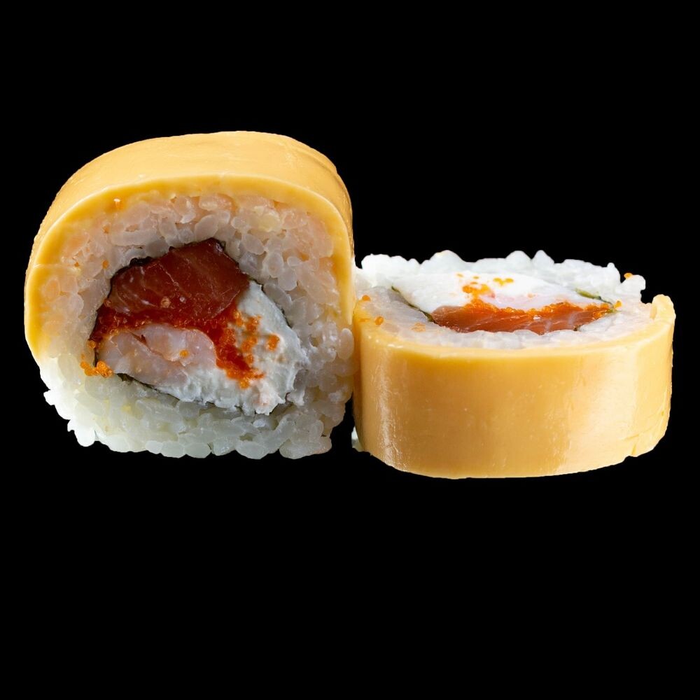 Лосось, креветка тигровая, сыр креметта, сыр чеддер, рис, нори.